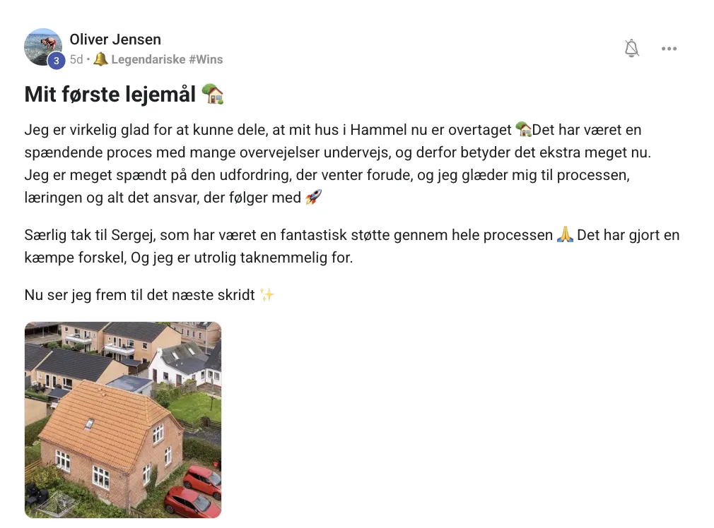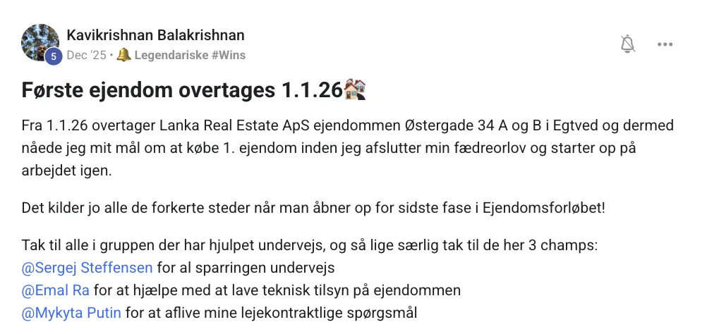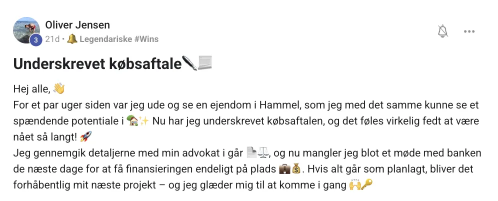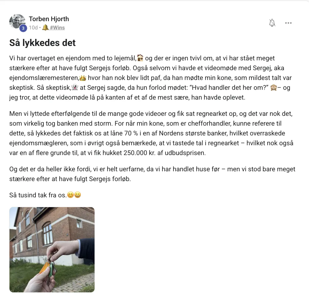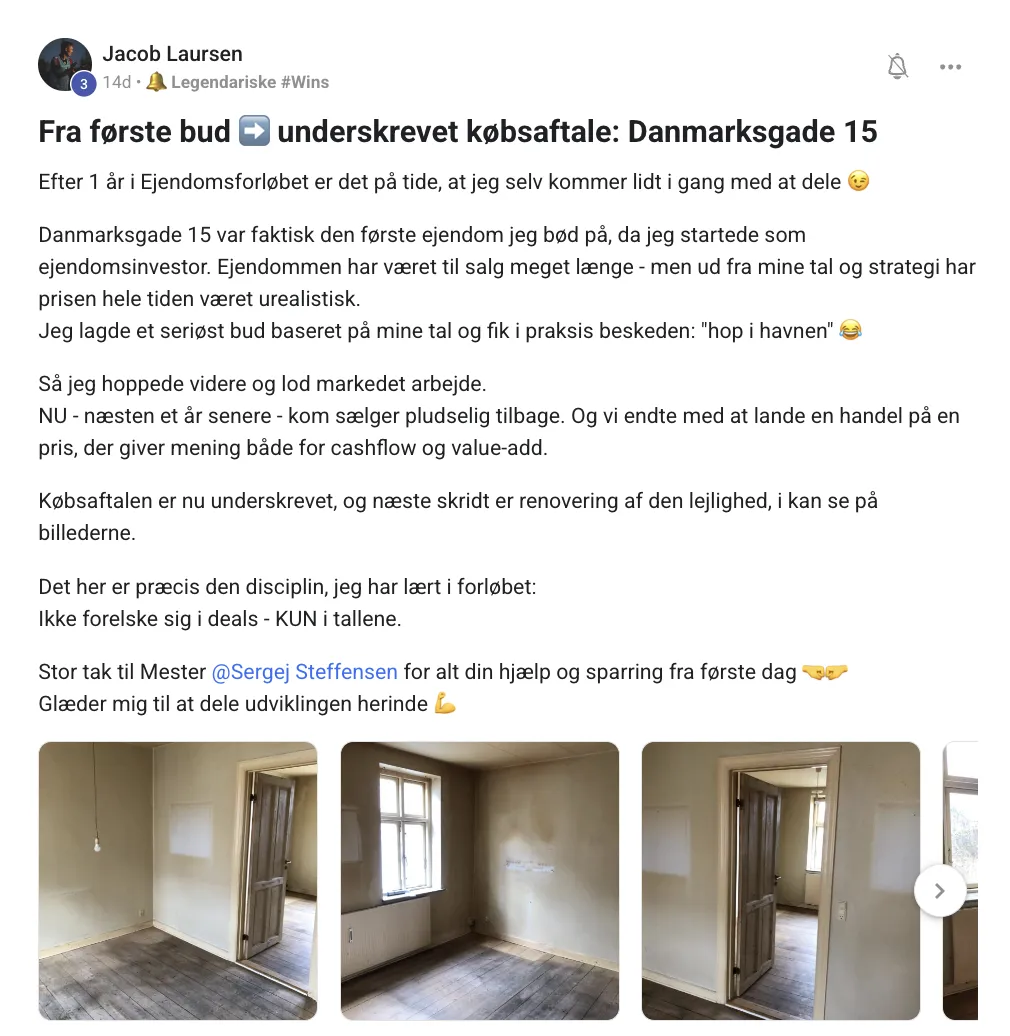 "Jeg har netop købt min første investeringsejendom – det føles helt vildt! Tak til hele fællesskabet." – Kristian Esteban Lorentzen