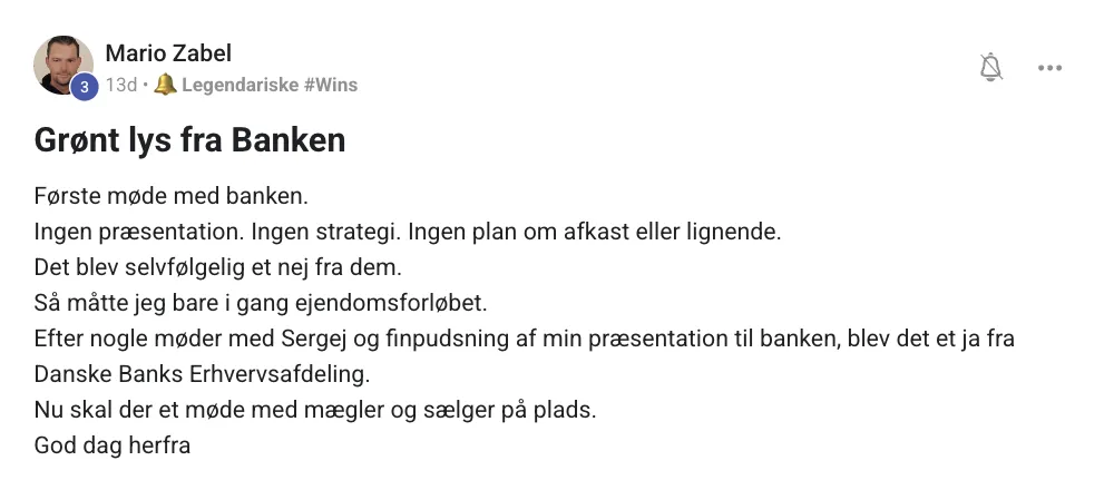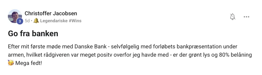 Efter mit første møde med Danske Bank - selvfølgelig med forløbets bankpræsentation under armen, hvilket rådgiveren var meget positv overfor jeg havde med - er der grønt lys og 80% belåning 🥳 Mega fedt! – Christoffer Jacobsen